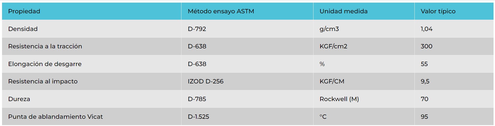 Polímero termoplástico, denso, impermeable, alto brillo, fácil de limpiar, atóxico, bajo costo, autosoportante. Presenta buena estabilidad térmica y dimensional. Es posible troquelar, cortar, doblar , pegar y termoformar.